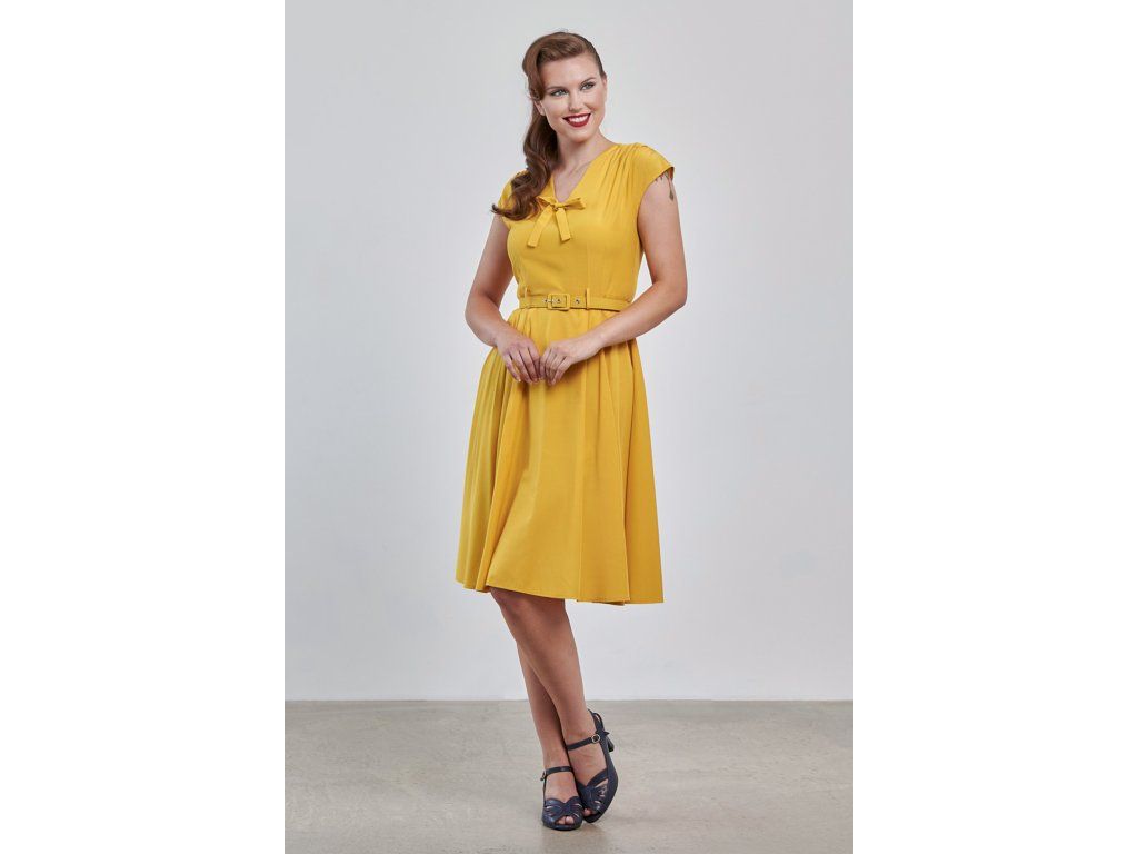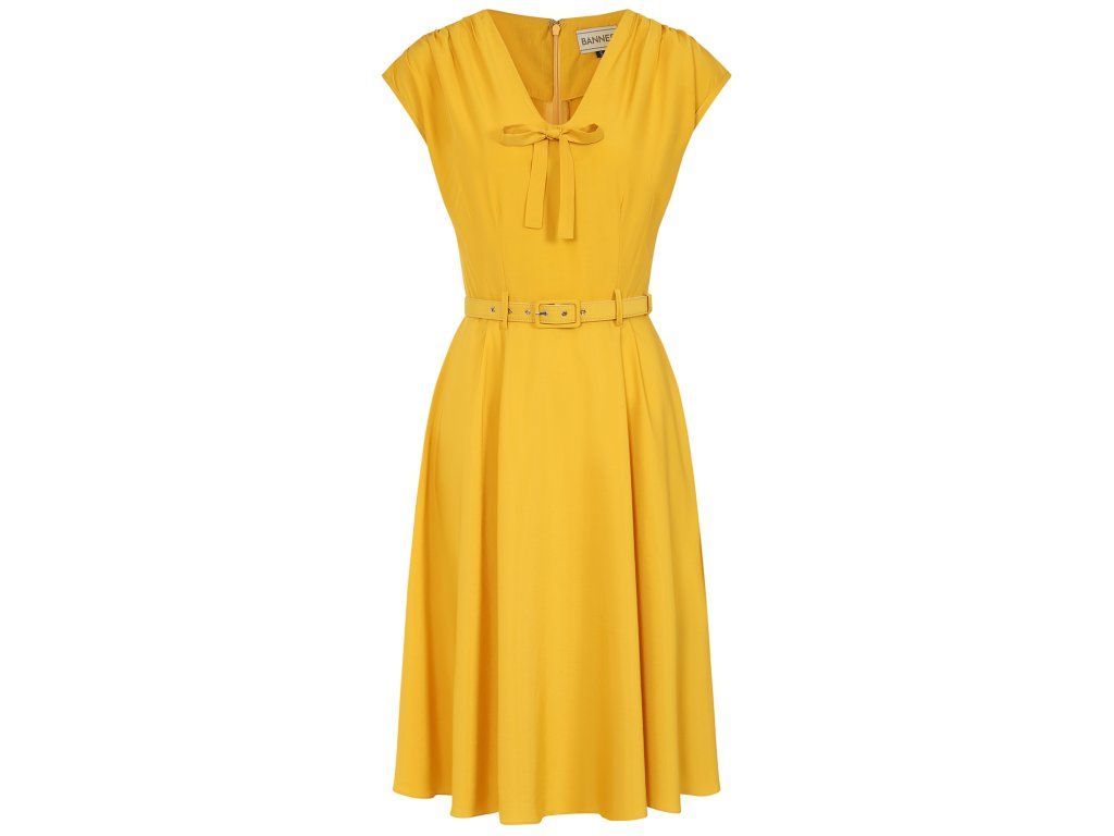- Elegantní hořčicově žluté retro šaty ve stylu 50. let, Holly od značky Banned Retro