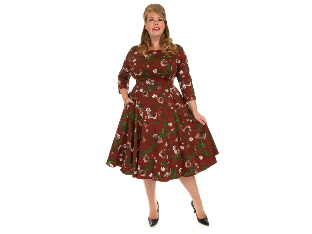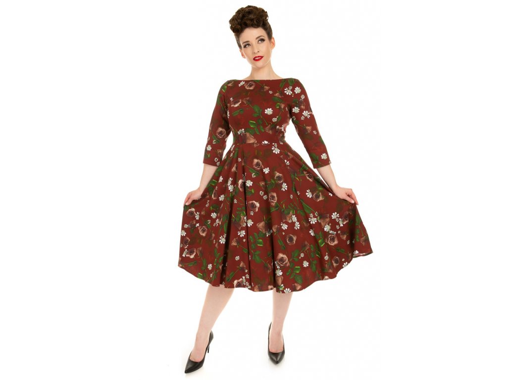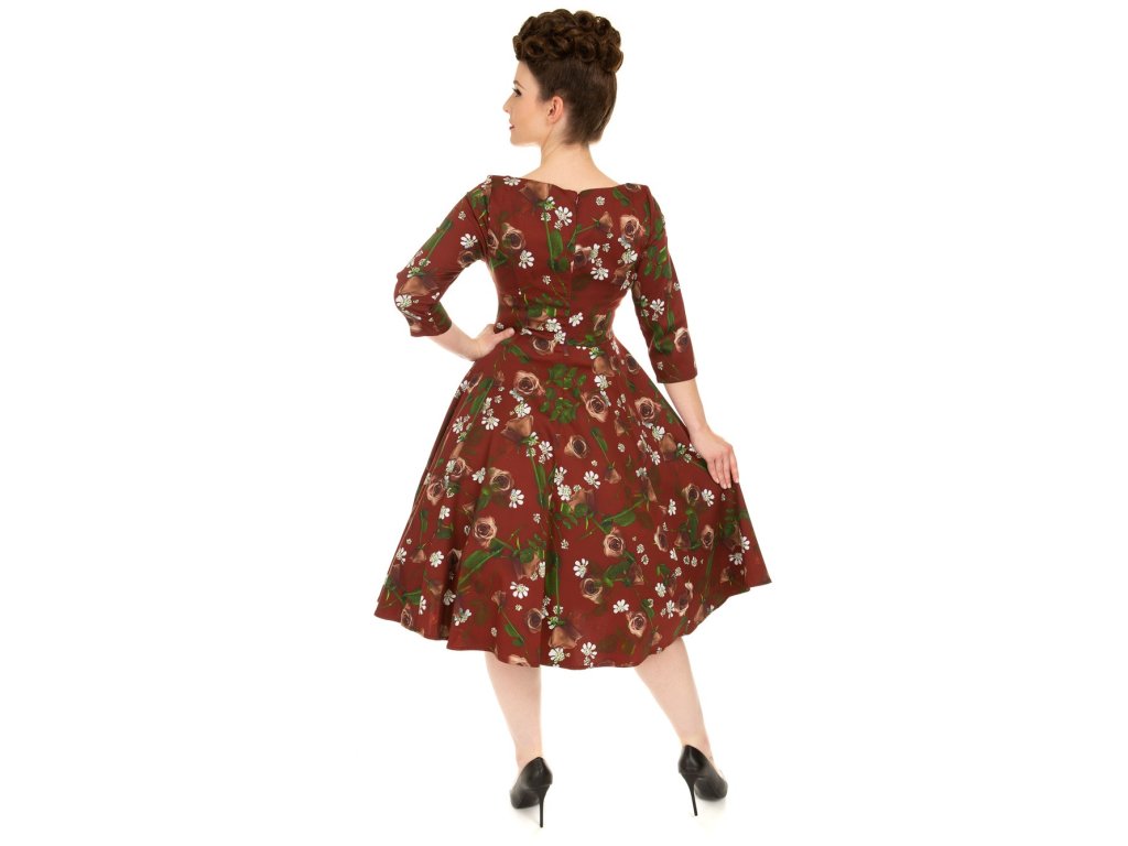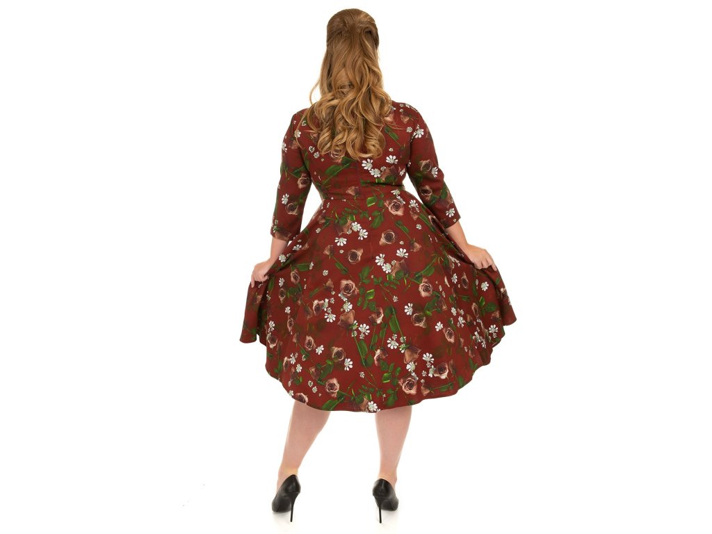 - Printed with brown roses with green leaves and white flowers on burgundy-brown background