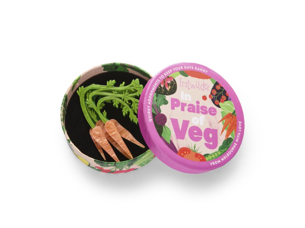 - Brož Carrot Topper od kultovního australského výrobce Erstwilder - edice In Praise of Veg 10/2025