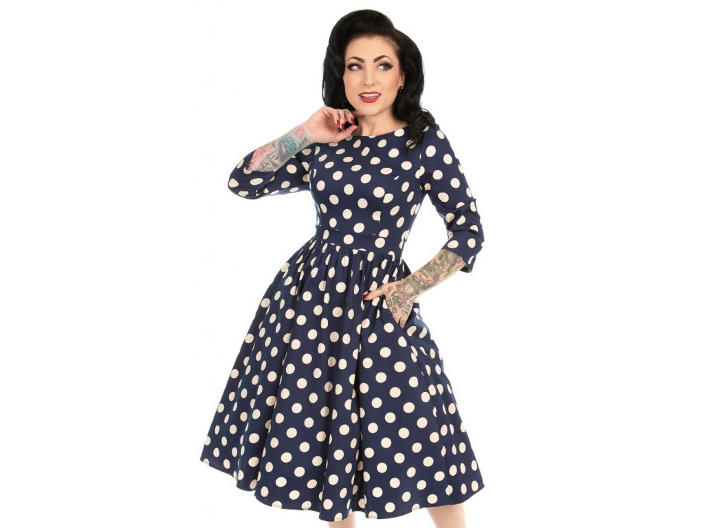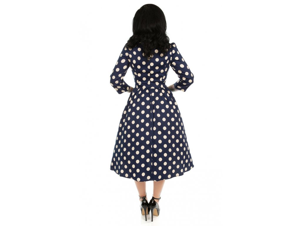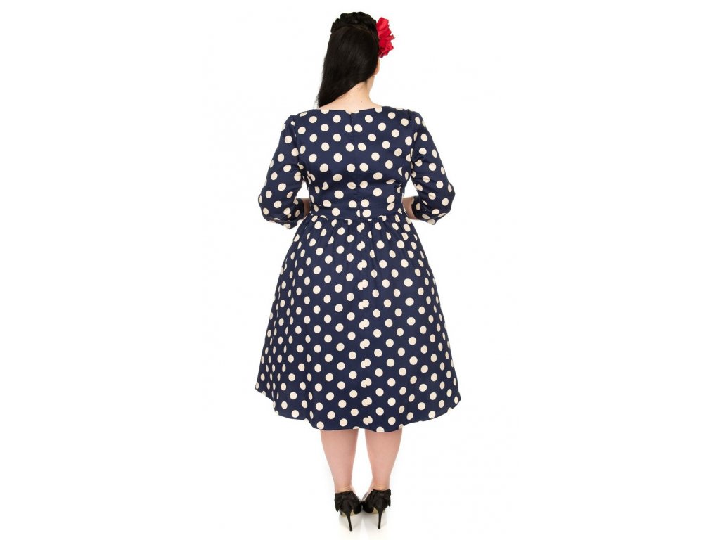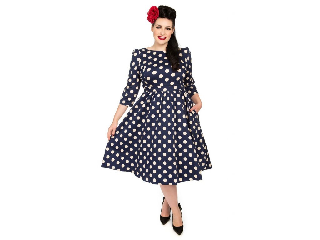 Modré retro šaty Milana s krémovými puntíky, s 3/4 rukávem a s kapsami