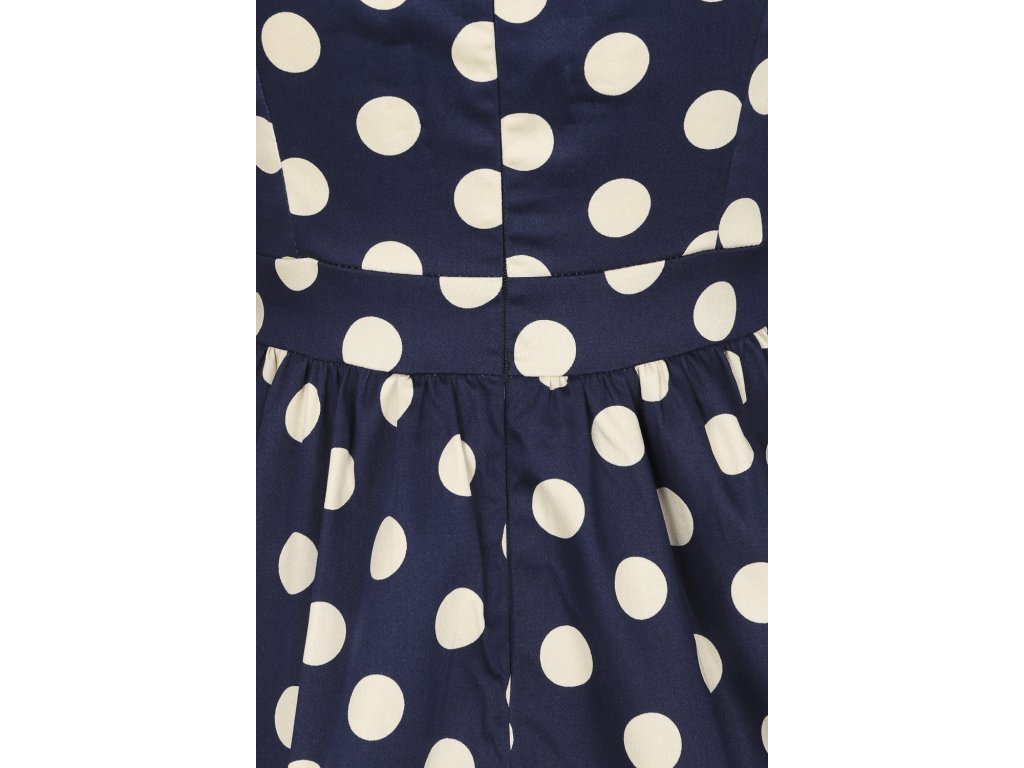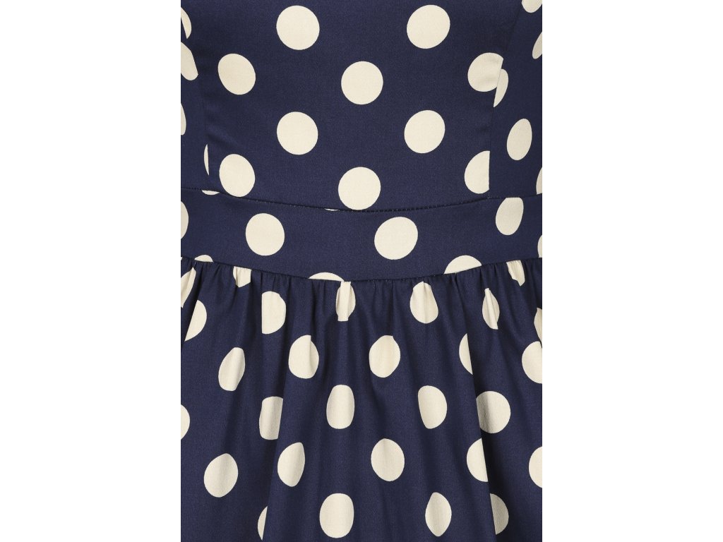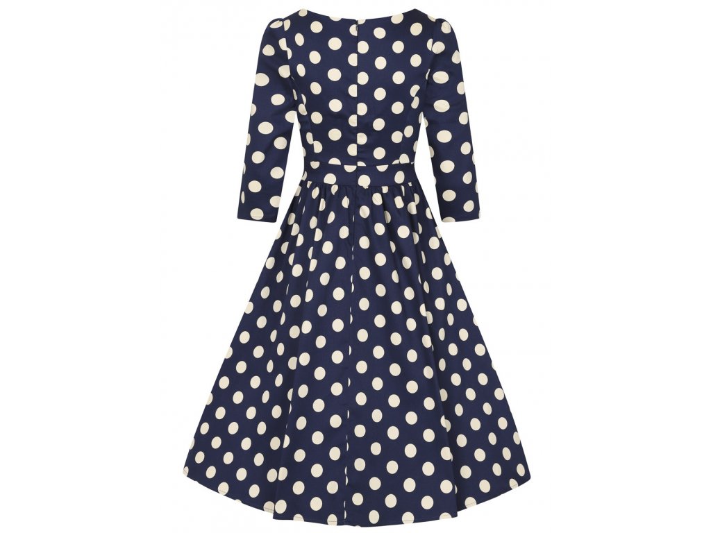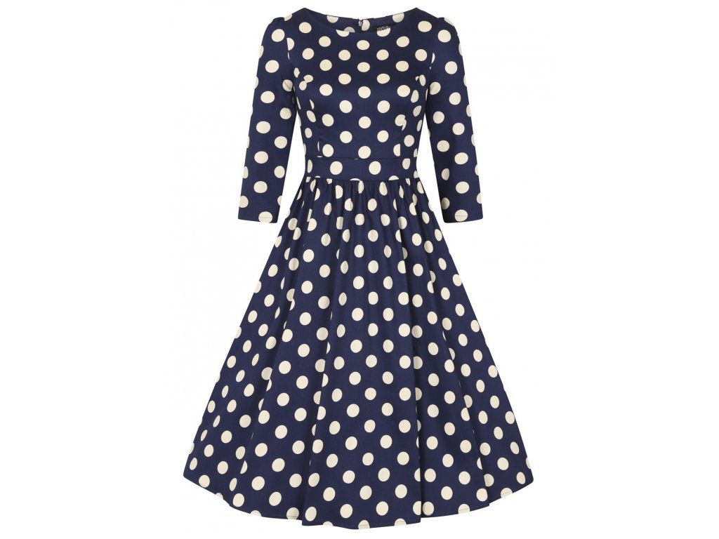 Modré retro šaty Milana s krémovými puntíky, s 3/4 rukávem a s kapsami