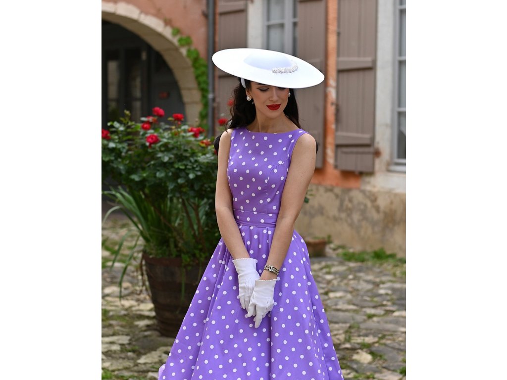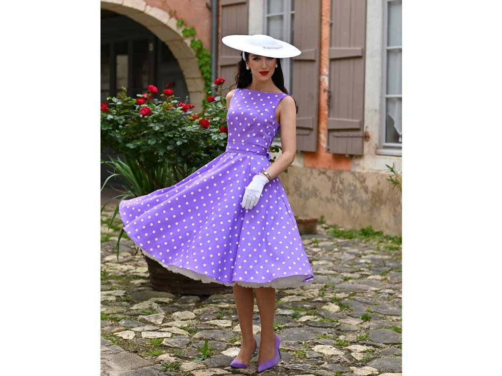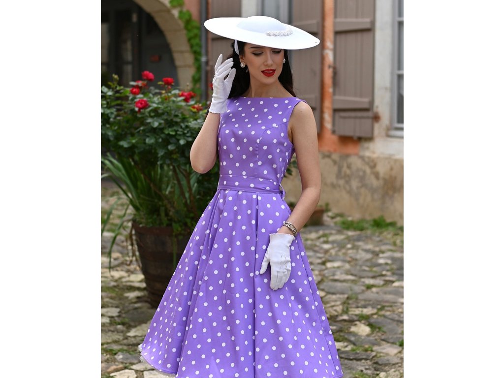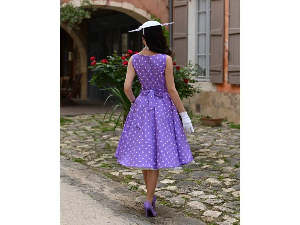 - Bavlněné retro šaty ve fialkové - lila barvě s bílými puntíky, Josephine od značky H&R London