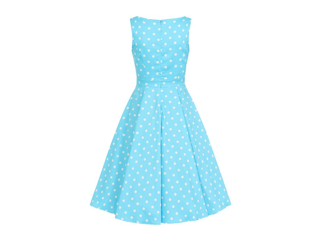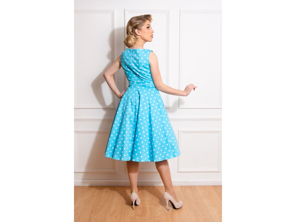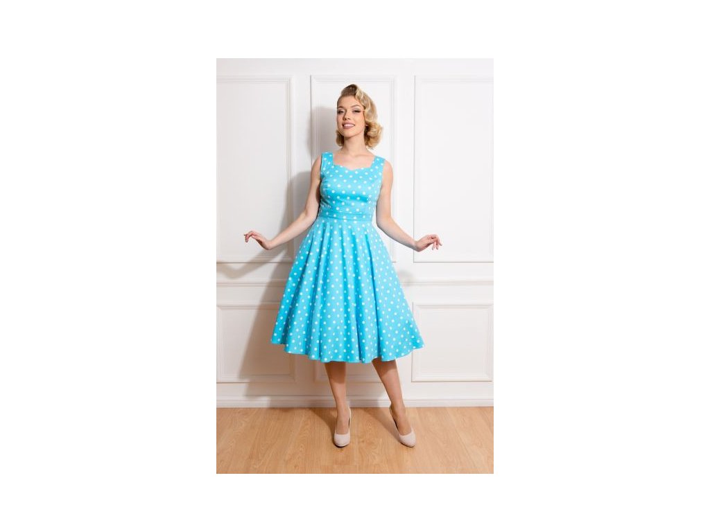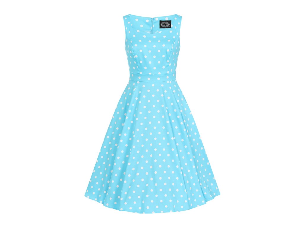 - Bavlněné retro šaty v překrásné zářivě blankytně modré barvě s bílými puntíky, Ruth od značky H&R London