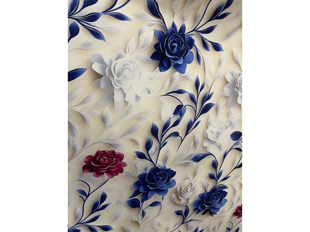 - Šaty Wildflower jsou ušity z pohodlné, strečové bavlněné látky s modrými, bílými a sytě růžovými růžemi ve 3D na vystínovaném podkladu
