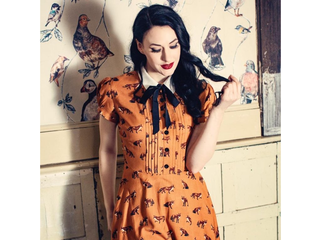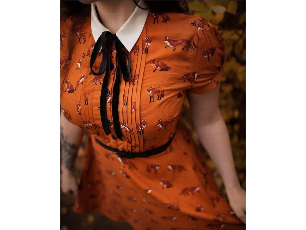 - Kratší oranžové - zrzavé šaty s liškami Vixey od značky Hell Bunny