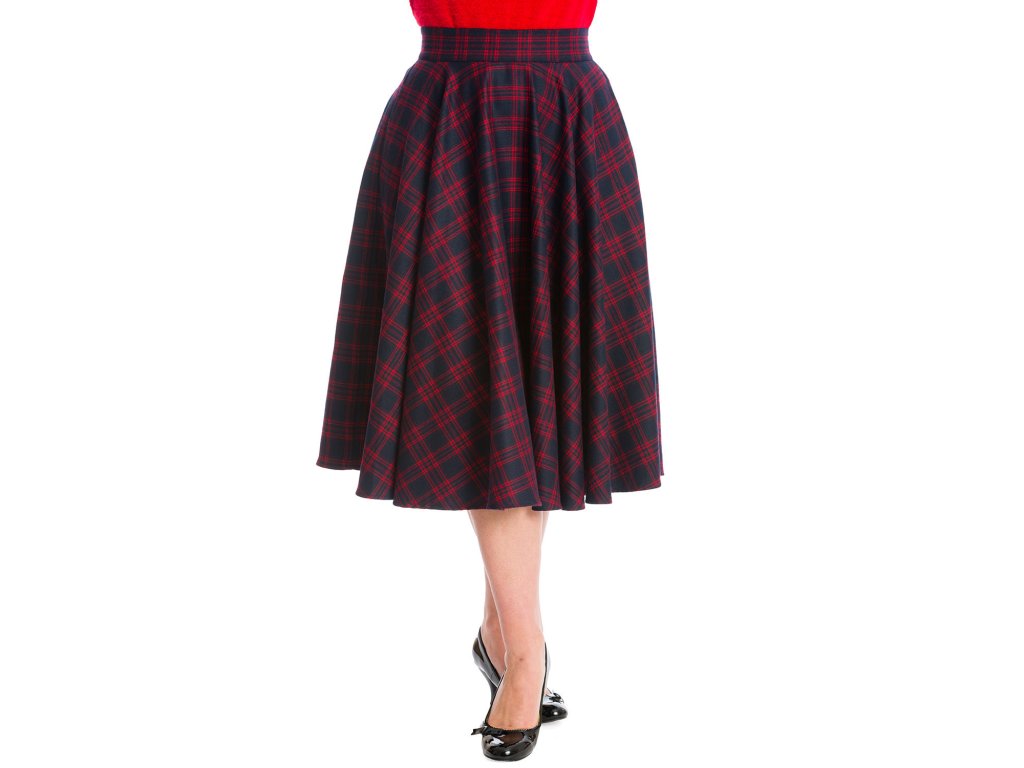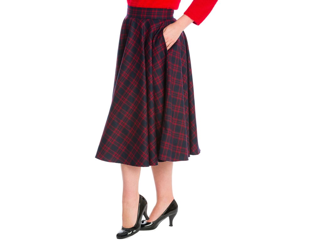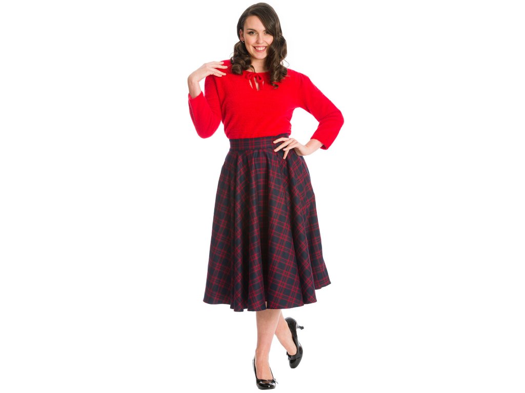 - Kolová retro sukně z červeného a temně modrého tartanu od značky Banned Retro