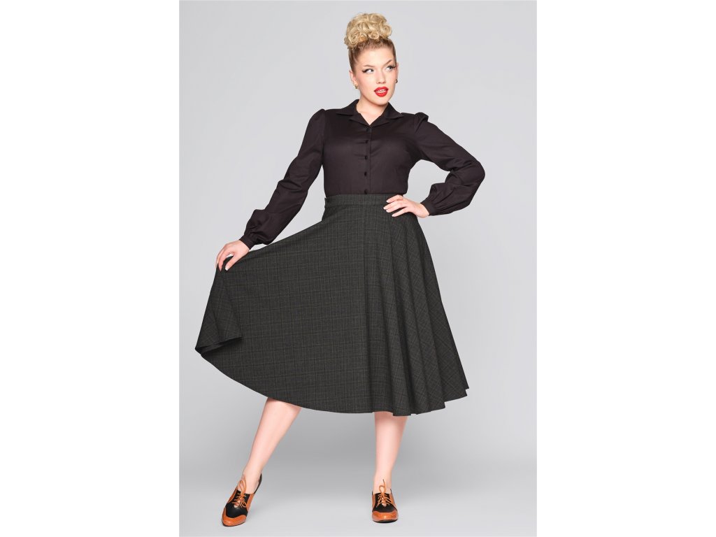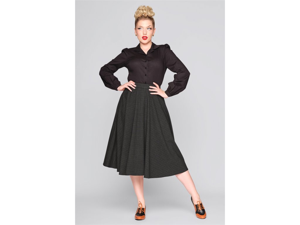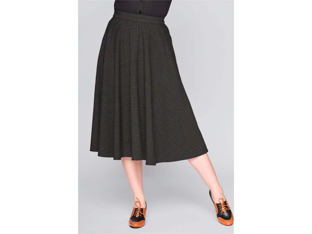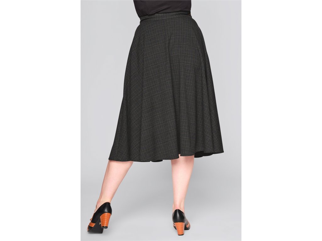 - Kolová retro sukně z tmavého tartanu "Professor Check (černo-šedý melír s tlumenými odstíny hnědé) od značky Collectif