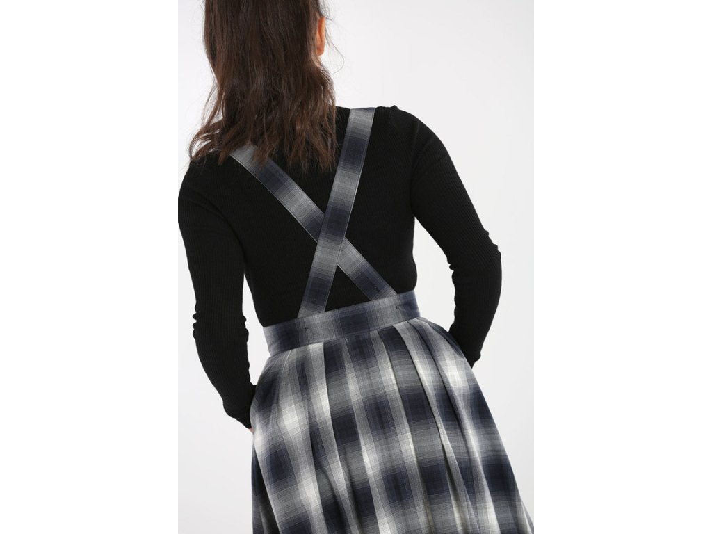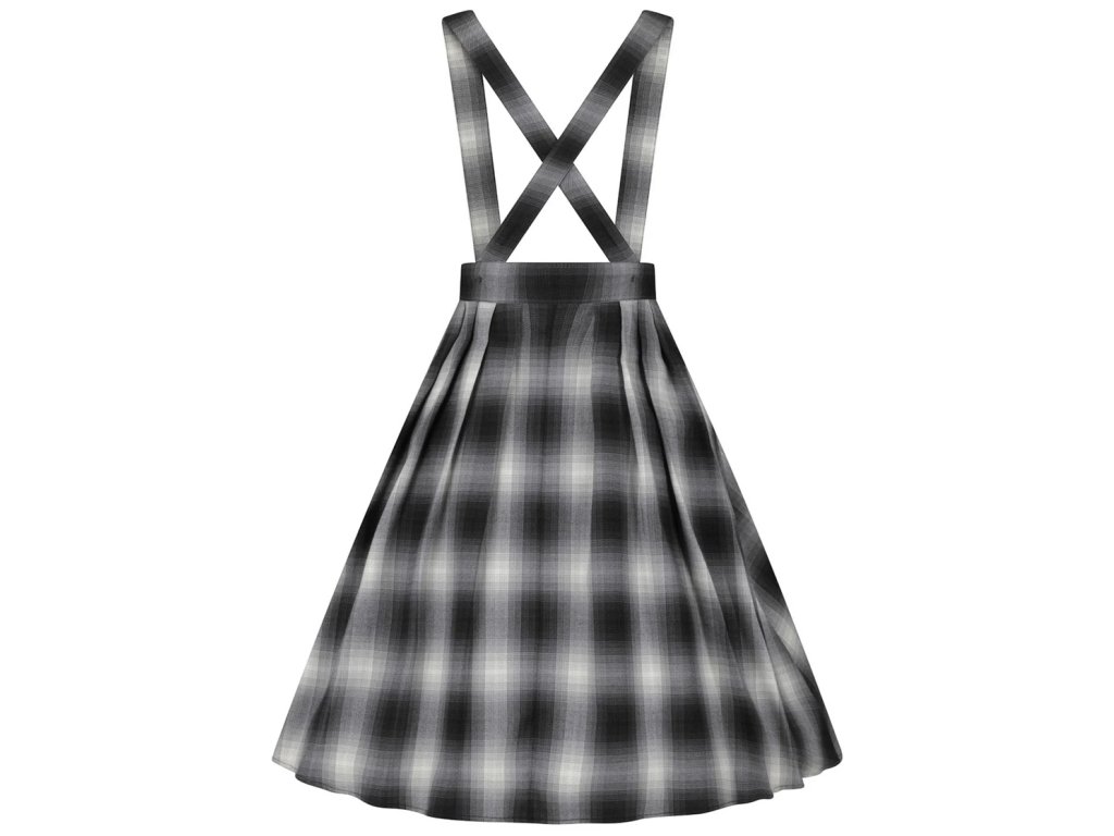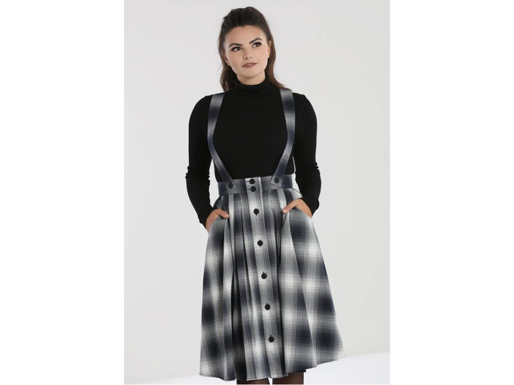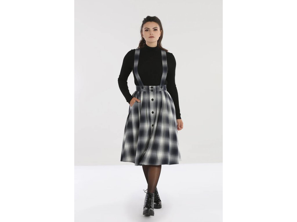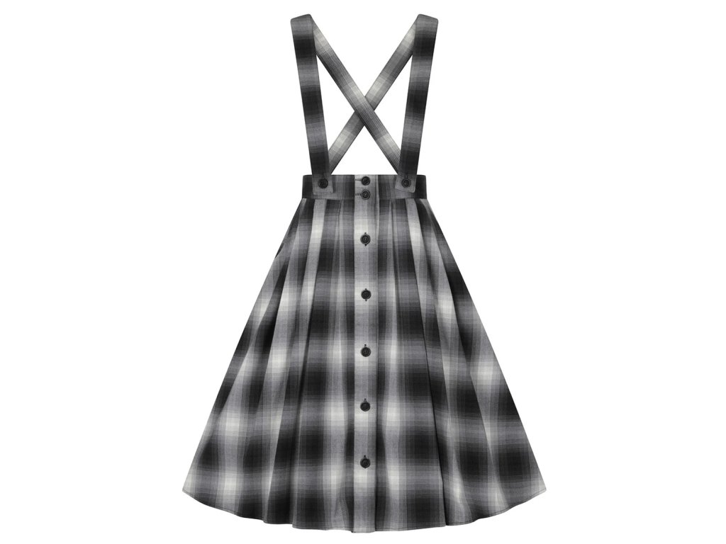 - Kostkovaná šedo-modrá a krémová retro sukně s kšandami Eddystone od značky Hell Bunny